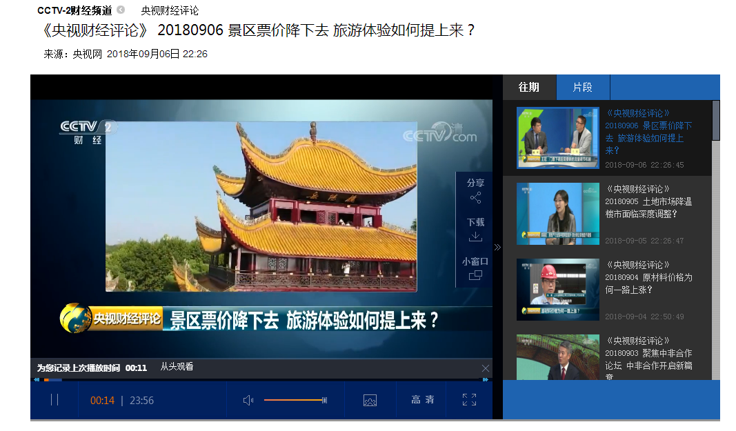 《央视财经评论》 20180906 景区票价降下去 旅游体验如何提上来?